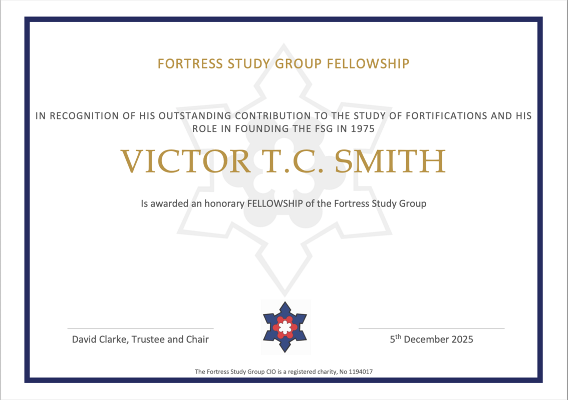 It is therefore my great pleasure today to award Victor the Fellowship of the Fortress Study Group in recognition of this substantial body of work in the study of artillery fortifications.”